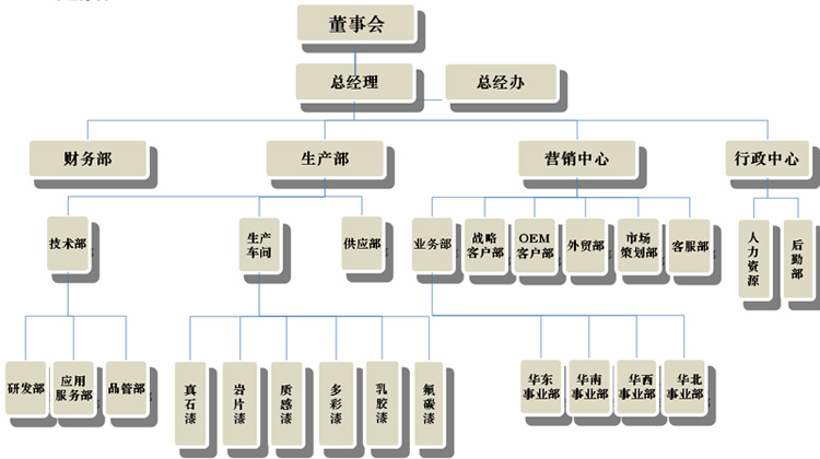 華石涂料公司成立于1998年,現(xiàn)今發(fā)展規(guī)模逐步壯大、架構(gòu)完整,分工明確,在董事會(huì)、總經(jīng)理下面主要設(shè)有四大核心部門(mén):