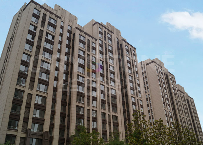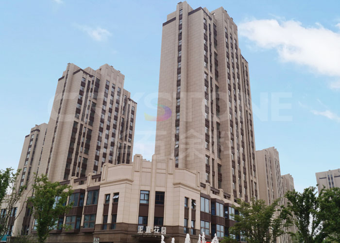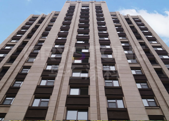 外墻裝飾選用華石巖片漆,采用高級(jí)丙烯酸乳液、天然彩砂、以及高耐候性巖片調(diào)制而成,具有石材自然、氣派、層次感強(qiáng)的特性,是石的質(zhì)感和漆的內(nèi)涵的有機(jī)統(tǒng)一,同時(shí)耐候性佳,保色性好,經(jīng)久耐用。